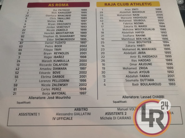 Roma :Rui Patricio (72' Fuzato); Karsdorp (72' Reynolds), Mancini (59' Kumbulla), Smalling (59' Ibanez), Vina (59' Calafiori); Cristante (72' Darboe), Veretout (59' Diawara); Zaniolo (59' Zalewski), Mkhitaryan (72' Bove), El Shaarawy (46 Perez) (86' Tripi); Shomurodov. A disposizione:, Ciervo,.: All. José Mourinho