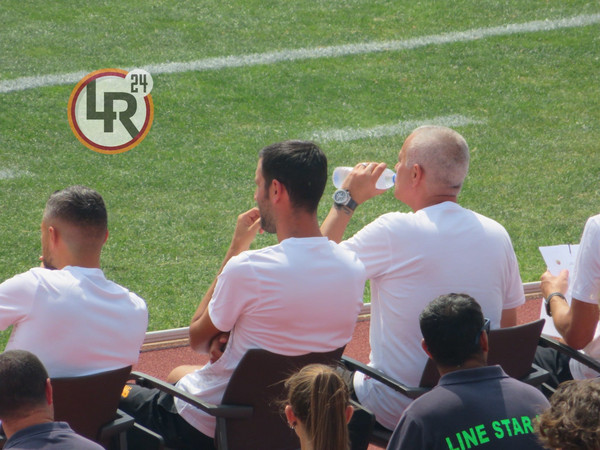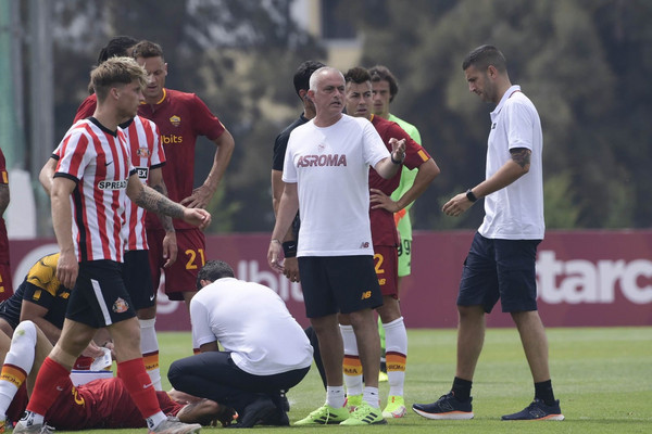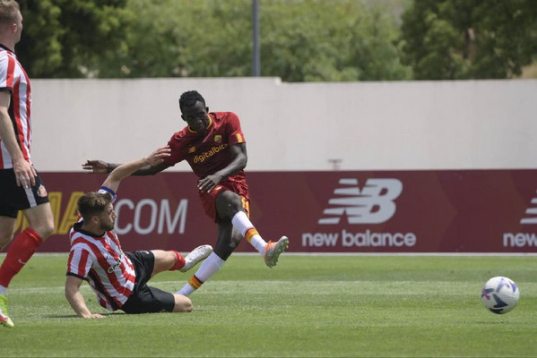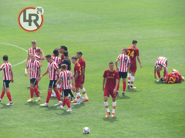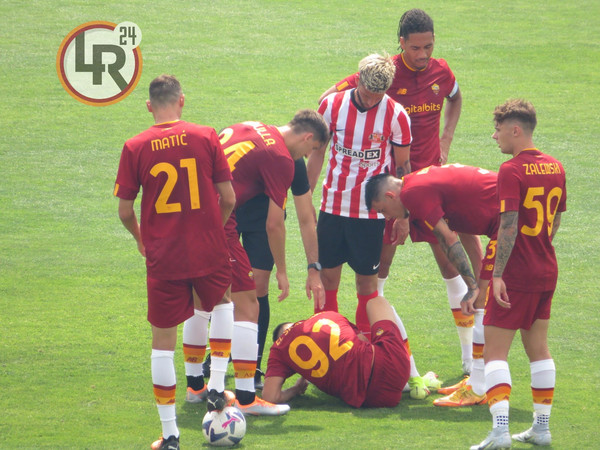 5' - Ritmi tipici da prima amichevole estiva. Su un attacco da destra del Sunderland, Svilar blocca in presa alta. Si nota la disposizione che ripercorre quella della scorsa stagione, con Matic che occupa il centro sinistra e Veretout più a destra e la coppia Carles Perez-El Shaarawy ad agire sotto e ai lati di Shomurodov.