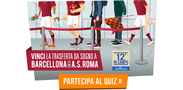 In palio un viaggio per due persone con volo in aereo insieme ai campioni giallorossi, hotel 5 stelle e biglietti per la gara al Camp Nou. Non solo, rispondendo al Quiz si possono vincere istantaneamente anche magliette autografate, palloni, cappellini, sciarpe e altro merchandising ufficiale della A.S. Roma.